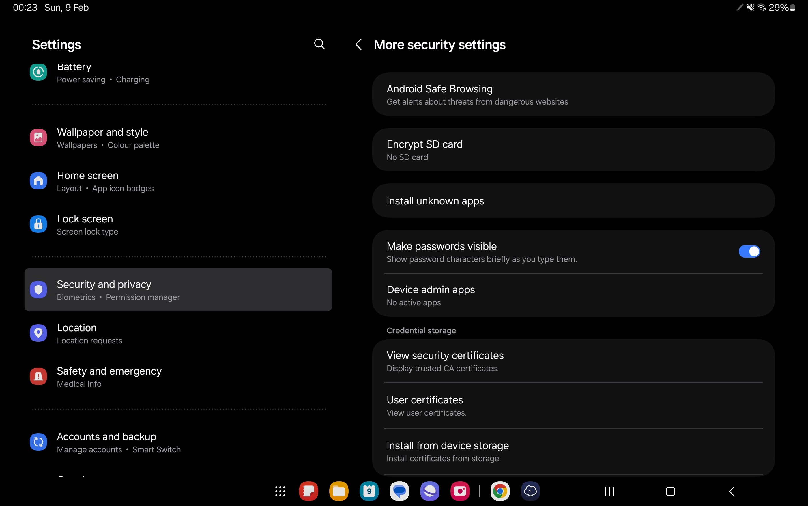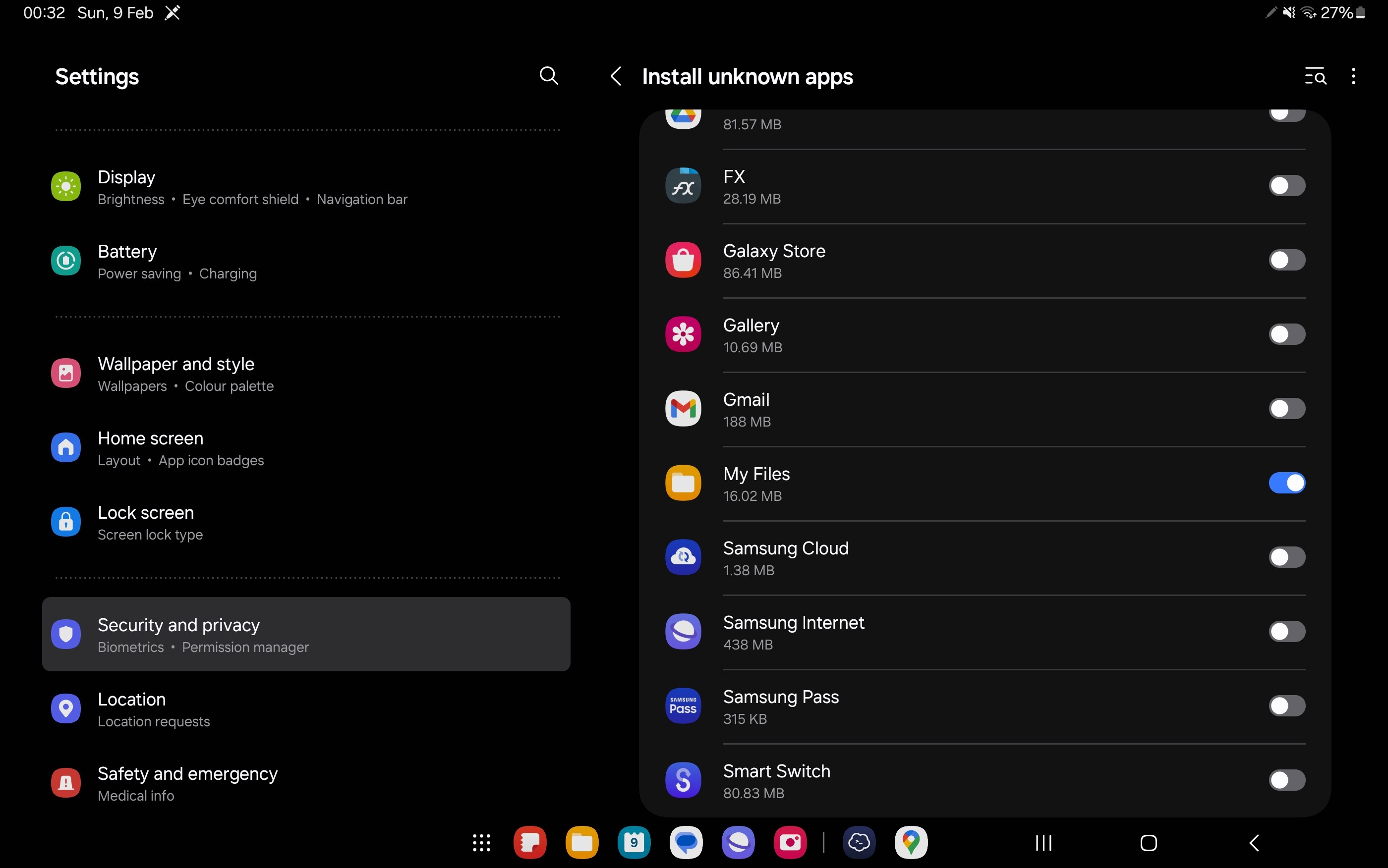 First things first, since you’ll be installing an APK from an external source, you need to allow your system to install sideloaded apps. For this, open Settings, then “Security and privacy” then “More security settings”, then “Install unknown apps”, there allow your file manager (in my case the default “My files”) to install unknown apps. Be sure to disable this again after finishing with the installation.
